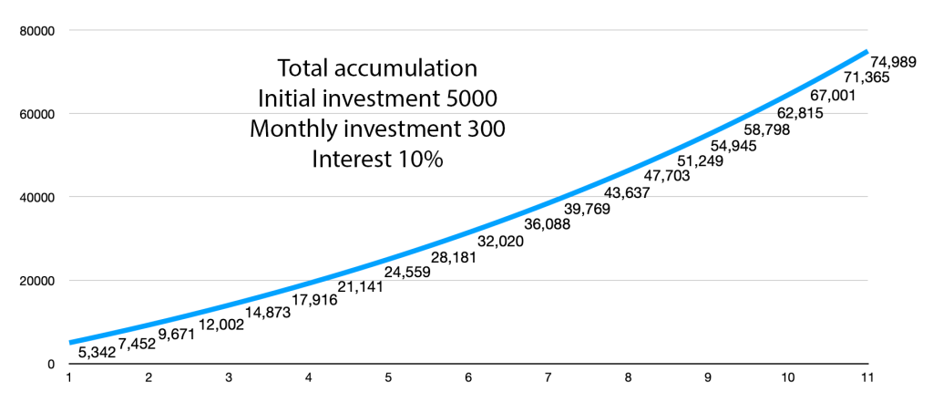 Pentru a înțelege că nu este o glumă, îți prezint două grafice despre dobânda compusă. Primul este graficul care arată ce se întâmplă cu economiile tale când economisești 300 de euro timp de 10 ani, cu o depunere inițială de 5000 de euro. După 10 ani de investiție constantă și adăugând și o dobândă de 10%, poți ajunge la frumoasa sumă de 75.000 de euro.