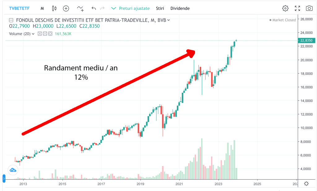 Ca exemplu, în acest grafic avem evoluția indicelui care include cele mai valoroase companii de pe Bursa de Valori București – aici putem vedea că media acumulată pe ultimii 10 ani este de 12%.