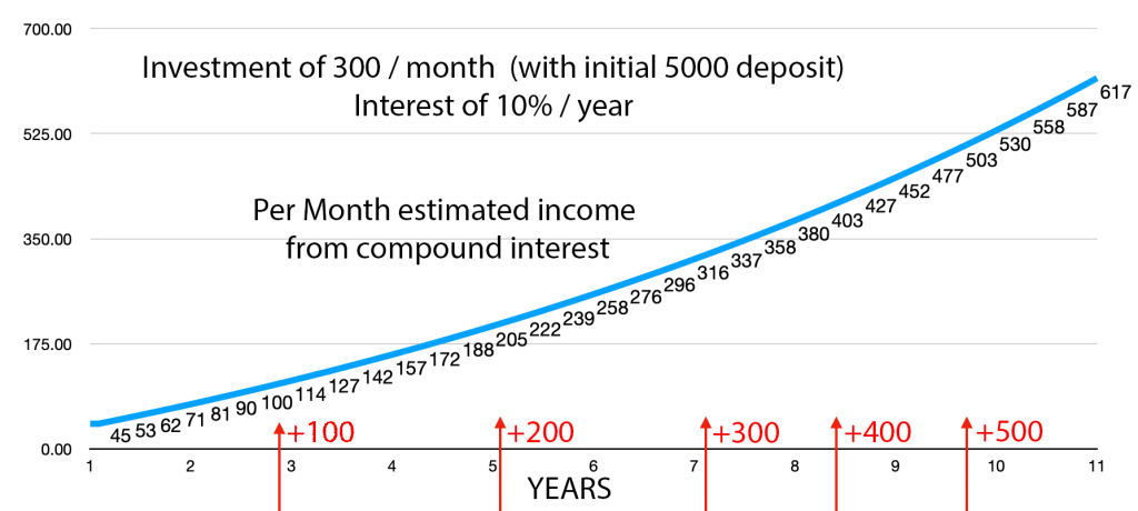 Ce pot vedea din acest grafic este că, după 2 ani de acumulare, ai putea câștiga aproximativ 100 de euro lunar doar din dobânda compusă, iar în 5 ani poți ajunge la 200 de euro.