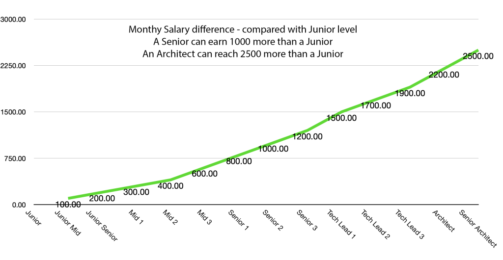 Atenție – valorile pe care le-am pus pe grafic nu sunt salarii, ci diferențe estimative, care arată cam cu cât poate câștiga un programator la nivelul următor față de cineva mai junior.