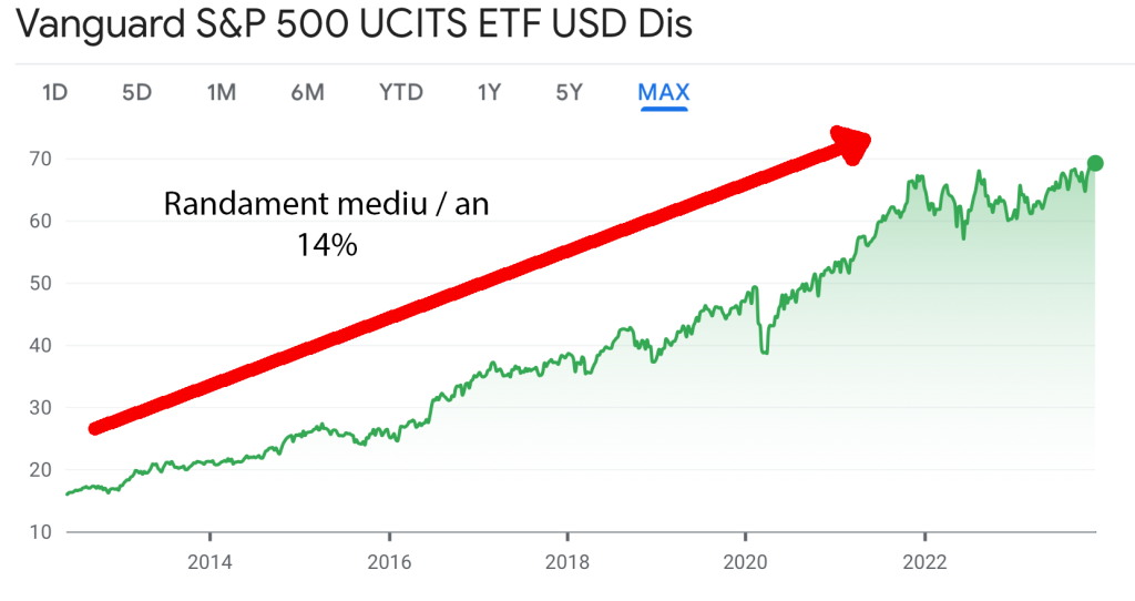 Un alt exemplu notabil este reprezentat de fondurile index de pe piața americană. Luând în considerare, fondul Vanguard S&P 500, care include cele mai valoroase 500 de companii din Statele Unite, observăm că are un randament istoric de 14% pe ultimii 10 ani.